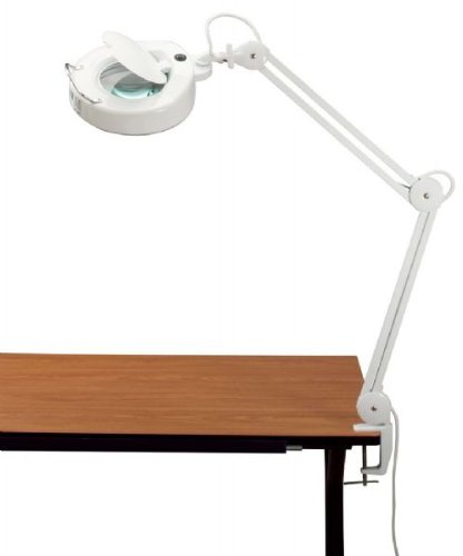 Professional, low heat magnifying lamp with high quality, extra-large 5" diameter lens features a fully adjustable internal spring arm with a 45" reach. Convenient stay cool handle on head for positioning. 3-diopter glass lens provides 1.75x magnification. Removable protective lens cover makes this magnifier lamp usable as a table lamp. Takes one T5 22w daylight simulation bulb (included). Includes heavy-duty desktop mounting clamp that fits up to 2½" thick surfaces. All metal construction. UL listed.